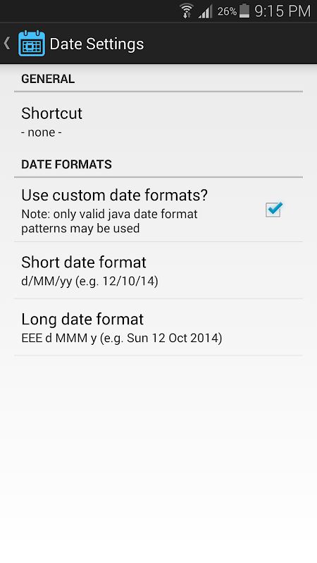 This DashClock extension simply displays your devices' current date. A customisable shortcut can be set to open when the extension is clicked. By default the extension will display the current date using your devices preferred format, however, an advanced option allows you to override the date format to one of your own using a standard java format pattern (see http://docs.oracle.com/javase/7/docs/api/java/text/SimpleDateFormat.html)