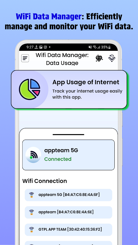 تتبع استخدام بياناتك مباشرةً - سواءً عبر بيانات الهاتف المحمول أو شبكة الواي فاي أو التبديل بينهما. يعرض هذا المتتبع المتقدم للبيانات ومحلل استخدامها إحصائيات آنية واستخدام التطبيقات للمساعدة في مراقبة استخدام البيانات بدقة.