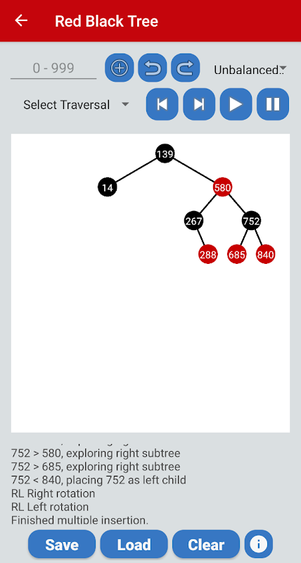 The trees offer the functionality of inserting and deleting nodes with corresponding animations. All actions are accompanied by a readout at the bottom of the screen explaining what the algorithm is doing. The user can also perform the following traversals on the trees: