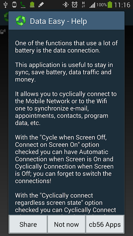 This application is useful to save battery, data traffic and money, also limit the device radiation and stay in sync.