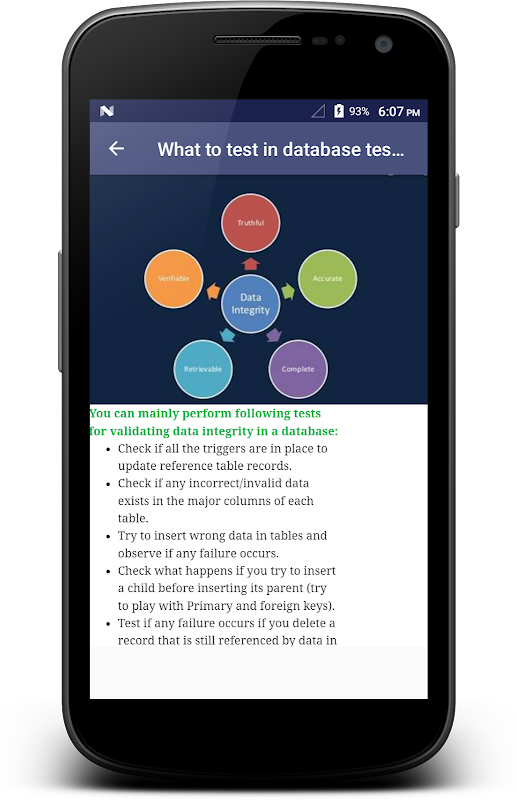 تشمل الموضوعات التي يتم تناولها في التطبيق عملية الاختبار ، والمكونات المختلفة ، واختبار البرنامج التعليمي مع عينة من حالات الاختبار ، والرؤى ، وكيفية الاختبار ، والاختبار الأساسي ، والاختبار الهيكلي ، واختبار العمود ، والإجراءات المخزنة ، واختبار المشغل ، والتحقق من صحة الخادم ، والاختبار الوظيفي ، وتسجيل الدخول وأمان المستخدم الاختبار غير الوظيفي ، واختبار الحمل والضغط ، والأساطير والمفاهيم الخاطئة المتعلقة باختبار قاعدة البيانات ، وأفضل الممارسات ، واختبار البرامج لإنترنت الأشياء ...