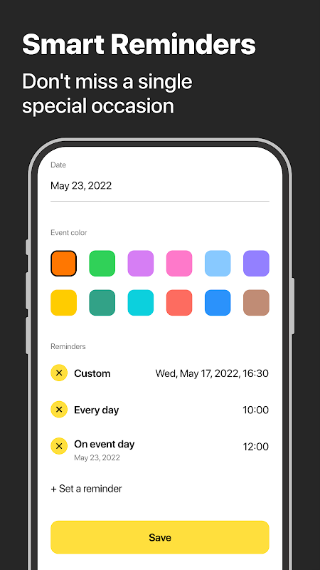 بالإضافة إلى ذلك ، يساعد هذا التطبيق المستخدمين أيضًا في الاحتفاظ بسجل لجميع الأحداث الماضية ويسمح لك بعمل نسخة احتياطية من التواريخ والأحداث المهمة ومزامنتها. علاوة على ذلك ، يتميز بتصميم أنيق ، ويمكنك حتى تخصيص لون الواجهة وفقًا لاحتياجاتك. علاوة على ذلك ، يمكنك ترتيب الأحداث بمجرد تحريكها بلمسة من إصبعك.