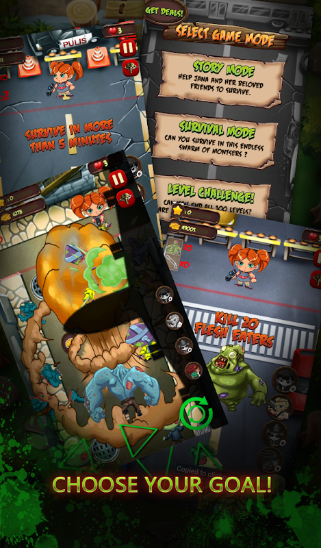 Join Jana and her friends discover the truth behind the calamity that might end all of mankind, the Apocalypse, and more importantly survive their impending doom! Unravel 12 different stories about Jana and her friends, unlock 99 different levels or play in Survival mode in which you will need to defeat the endless monsters swarming your way! Don't worry though since in this game help comes when you need it. Unlock and use 4 more different characters with different abilities to aide you in battle. Place turrets to automatically attack the monsters that will try to eat you alive. Or even call an air strike to bombard against your enemies!