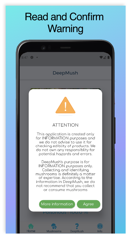 DeepMush هو تطبيق تم تطويره باستخدام الذكاء الاصطناعي. تم تطوير DeepMush باستخدام الذكاء الاصطناعي من خلال جمع ما يقرب من عشرين ألف صورة لأكثر أنواع عيش الغراب السامة وغير السامة شيوعًا في العالم. الغرض من DeepMush هو لأغراض المعلومات فقط. من المؤكد أن جمع الفطر والتعرف عليه مسألة خبرة. وفقًا للمعلومات الواردة في DeepMush ، لا نوصي بجمع الفطر أو تناوله!