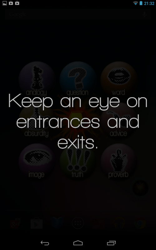 ► Usage is very easy: Simply open the app and choose amongst eight categories of answers: absurdity, advice, analogy, image, proverb, question, truth and word.