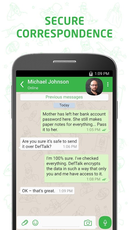لديها خيارات أمنية إضافية، مثل وضع كلمة مرور إضافية على DefTalk، وتشفير البيانات على الهاتف المحمول الخاص بك، أو استخدام جهاز توقيت لتحديد موعد نهائي عندما سيتم تلقائيا مسح التاريخ محادثتك.