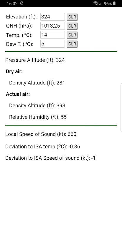 Calculates the pressure altitude and the density altitude for the dry air and also for the actual air mass accounting for the relative humidity. The calculations are presented when the user inputs the elevation, the QNH, the air temperature and the dew point temperature.