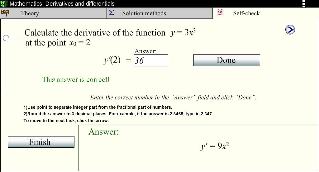 ويهدف التطبيق لبدوام كامل وبدوام جزئي طلاب الجامعات، طلاب المدارس، وكذلك لكل من يريد أن يتعلم أو تكرار أساس التمايز، وتعلم كيفية حساب المشتقات من وظائف متغير واحد. يمكن استخدام التطبيق بشكل مستقل والكتب المدرسية ومشكلة الكتاب، وأيضا كمادة تكميلية إلى الكتب المدرسية وكتب المشكلة موصى بها من قبل الجامعة.