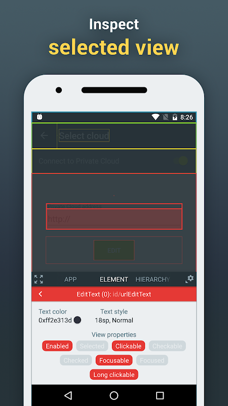 يمكن للمختبرين الذين يكتبون اختبارات الأتمتة، والمطورين الذين يبحثون عن الأخطاء، فحص تسلسل العناصر المعروضة على الشاشة مباشرةً من الجهاز المحمول. يشبه هذا المفهوم فحص صفحات الويب باستخدام أدوات التطوير المعروفة المرفقة مع متصفحات الويب الرائدة.