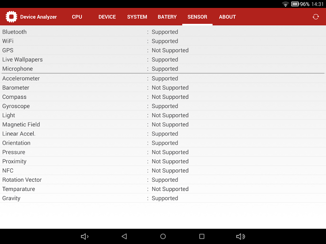 - Sensor info : Bluetooth, Wifi, GPS, Accelerometer, Barometer, Compas, Gyroscope, Light, Magnetic field, Pressure, Proximity, NFC, Rotation Vector and Gravity.