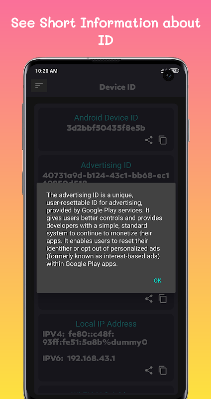 التطبيق بسيطة للحصول على معلومات وجهاز / ID / عناوين IP / MAC المحلية والمسلسل التي تسمح لك بسهولة نسخ وتبادل ID من الجهاز المحمول الخاص بك.