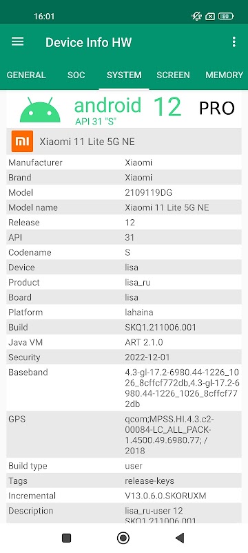 يحاول التطبيق توفير أقصى قدر ممكن من المعلومات. إذا كان لديك جذر ، يمكن للتطبيق قراءة المزيد (قم بالتبديل في الإعدادات)
