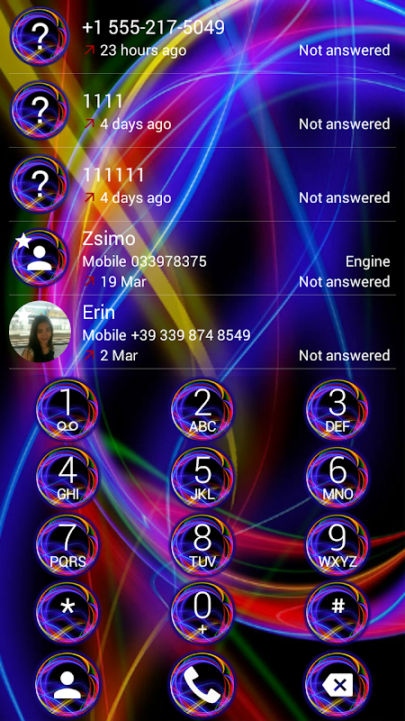 سيعطي لوحة الاتصال الهاتفي الخاص بك مظهرًا عصريًا باللون الأسود والنيون متعدد الألوان مع واجهة ومفاتيح مزينة بأضواء دائرية.