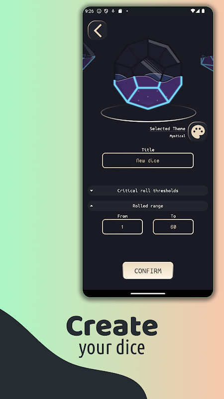 هدف هذا التطبيق هو تزويدك بأكبر قدر ممكن من خيارات التخصيص ، حتى تحصل على أفضل تجربة لعب ألعاب لعب الأدوار على الطاولة. يتيح لك إنشاء نرد خاص بك ، وتعيين نطاق التدحرج ، والعتبات الحرجة ، وإعطائه عنوانًا وتغيير مظهره.