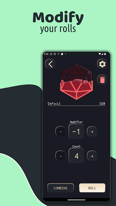 باستخدام هذا التطبيق ، يمكنك إنشاء مجموعة تكوين النرد الخاصة بك ، على سبيل المثال إضافة قدراتك المفضلة وآليات اللعب المطلوبة (مثل حفظ الرميات) وغير ذلك الكثير.