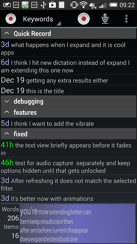 تظهر الشاشة الرئيسية الإملاء الخاص تجميعها وفرزها من قبل ختم الوقت، العنوان، أو كلمات.