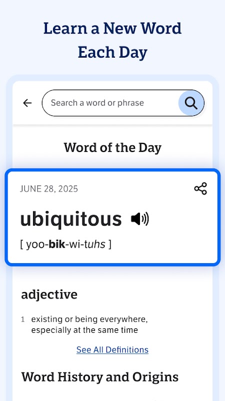 مع أكثر من 2 مليون تعريف ومرادف موثوق به، تم تحسين تطبيق القاموس الإنجليزي وقاموس المرادفات لنظام Android ليناسب جهازك المحمول. قم بتحسين مفردات اللغة الإنجليزية لديك، سواء كنت في بداية رحلة التعلم الخاصة بك أو كنت بالفعل معالجًا للكلمات. قم بتثبيت التطبيق للوصول إلى التعريفات والمرادفات متى وأينما كنت في حاجة إليها - لا حاجة إلى كتب ضخمة. انتقل إلى الوضع المظلم لمنح عينيك فترة راحة، أو التزم بالإعداد التقليدي.
