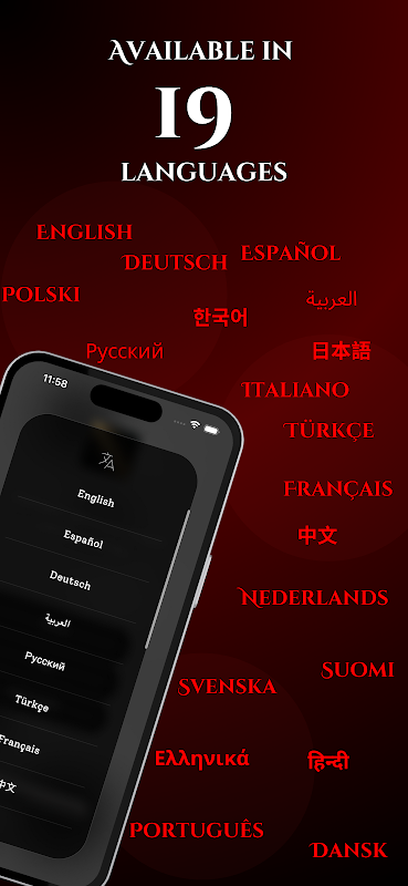 اللغات المدعومة: English, Español, Deutsch, العربية, Türkçe, Русский, Français, 中文, हिन्दी, Português, Italiano, 日本語, 한국어, Nederlands, Polski, Svenska, Dansk, Suomi, Ελληνικά.