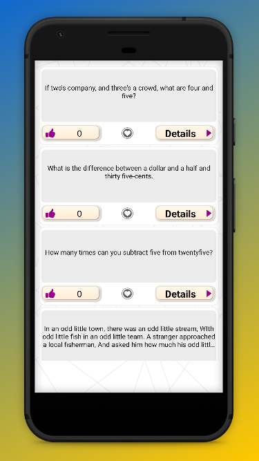 In our difficult riddles app you’ll find easy and little riddles,hard riddles to solve,funful and hard riddles to ask people,riddles to ask friends,riddles to solve,riddles to survive,smart riddles to ask people,hard and most difficult riddles to ask people and test your brain,riddles to make everyday funful etc and various types of intelligent riddles. By following our riddles app you can turn any boring situation into a friendly environment. If you are tired of the monotonous and boring routine of life due to extra work pressure,our difficult riddles app will be a help for you. It will help you turn any not friendly environment to an interesting and competitive ambience. Our riddles will also help you do brain storming. If you like our app then please share it with your friends and family to also let them know about the brain storming riddles.