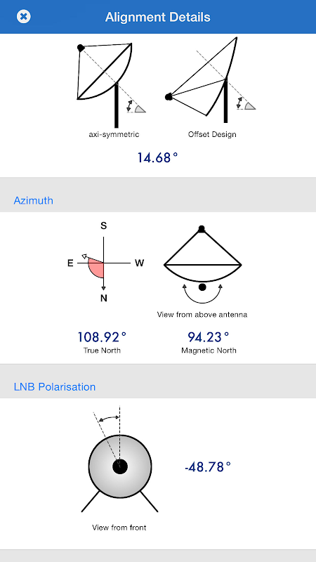 - عرض معلومات حول القمر الصناعي المحدد ، مثل زوايا السمت وارتفاع الموقع الخاص بك ، مما يسهل تثبيت الهوائي الخاص بك