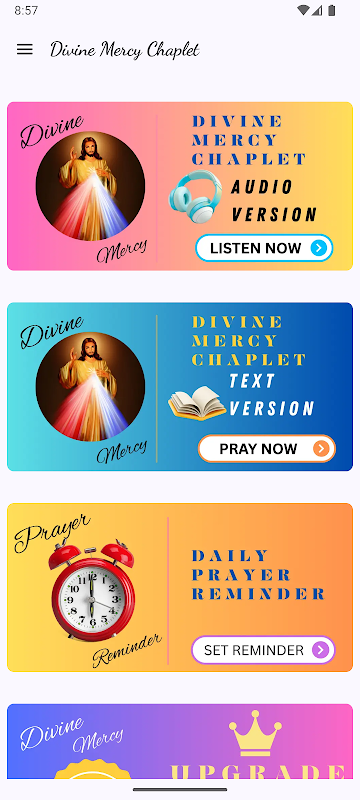 يحتوي تطبيق مسبحة الرحمة الإلهية على الخيارات التالية: