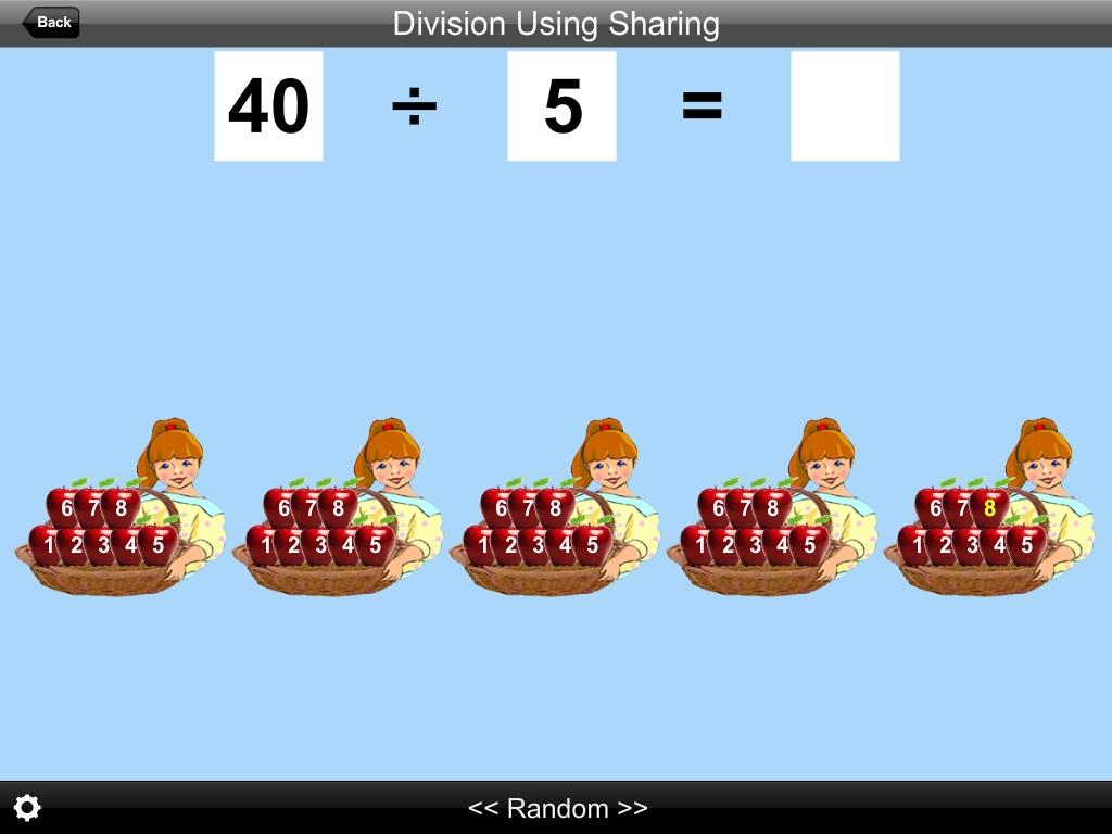 In this app, a division problem (for instance, 18 ÷ 2 = ) is illustrated by sharing a certain number of apples (18) between a certain number of girls (2). When the student clicks on the first number (18) that many apples (18) appear on the screen. When the student clicks on the second number (2) that many girls (2) with baskets appear. The student then clicks on each apple, which then moves into a girl’s basket. Each apple gets a number when it gets into a basket. The student will be told to click on the last apple in the last basket, which will be blinking (that apple’s number is the answer). That number (9) will rise into the number statement.