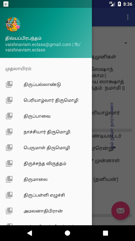 2. أن يكون لديك القدرة على القراءة من خلال paasurams التي كتبها Prabandam. من أجل استخدام هذه الميزة، انقر على الإنتقال تعادل (انظر على رأس يقم 3 خطوط أفقية).
