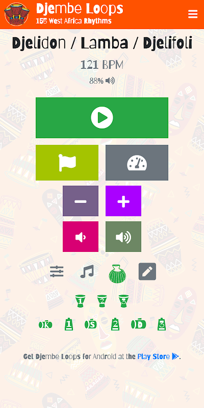 قم بإنشاء إيقاعاتك الخاصة أو قم بتحرير إيقاعات موجودة في غرب إفريقيا. احفظها على جهازك أو شاركها مع أصدقائك وطلابك.