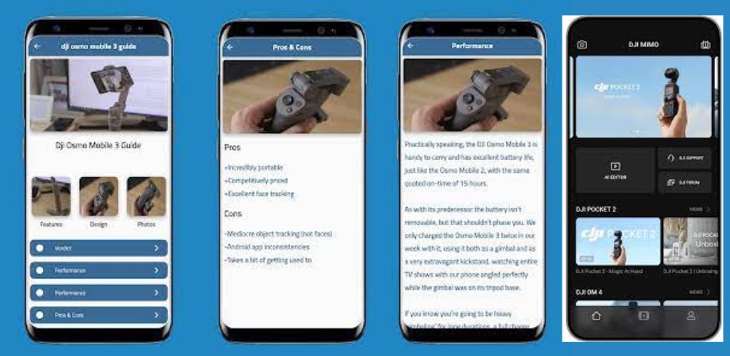 In DJI Osmo Mobile 2 Guide app we supported many sections of content that will let you now more information about DJI Osmo Mobile 2