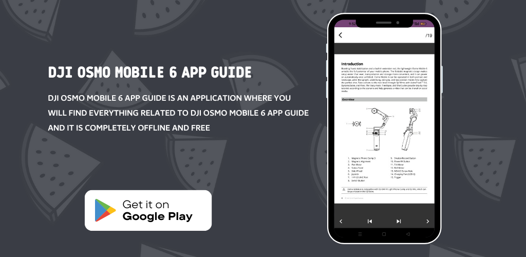الآن من خلال تطبيق DJI Osmo Mobile 6 Guide، يمكنك الحصول على دليل مستخدم DJI Osmo Mobile 6 الذي يمكنك الاطلاع عليه من خلال التطبيق، والذي يتم توفيره لك بطريقة واضحة وسهلة لتتعرف على كيفية استخدام DJI Osmo Mobile 6، و يمكنك الاطلاع على وصف المنتج حيث يتم عرض جميع مميزات ومميزات DJI Osmo Mobile 6 مما يجعله متميزا عن غيره من المنتجات المشابهة في نفس المجال. ومن بين هذه الميزات الوزن الخفيف، الحجم الصغير، وقابلية التمديد.