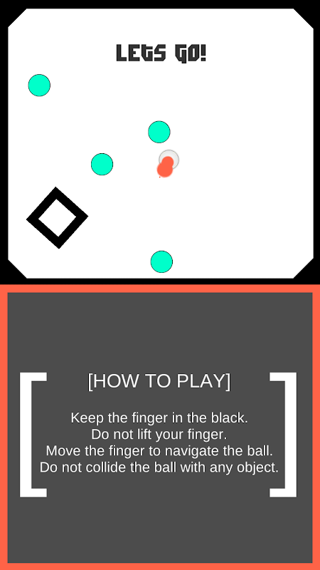 You need to keep your finger on the black area( use it like a virtual joystick) and make sure your ball does not collide with any object on the screen.