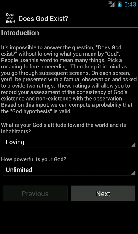 This application helps you explore an age-old question, "Does God Exist?" It starts by asking you to consider what you mean by God, then presents a series of observations. You'll be asked to indicate how consistent each observation is with the existence and non-existence of God. In the end, the odds that God exists are computed.