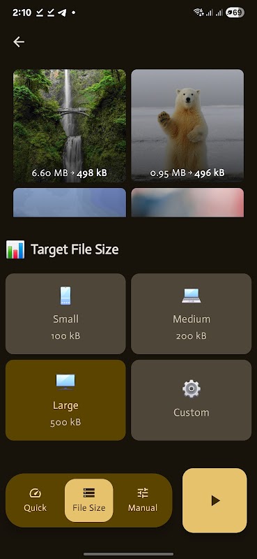 التحكم في الدفعات: ضع عشرات الصور في قائمة انتظار؛ طبّق إعدادات مسبقة سريعة للضغط، أو اضبط الجودة والدقة يدويًا. وضع الحجم المستهدف: اضبط حجم الملف النهائي بالكيلو بايت أو اختر عرضًا وارتفاعًا دقيقين لتغيير حجم الصورة؛ لا حاجة للتخمين.