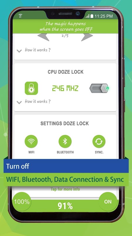 Not only apps you can hibernate unnecessary settings like WIFI, Sync, bluetooth to save even more battery of your smartphone. Doze - Battery Saver App also improves performance of your android device by cooling down CPU.