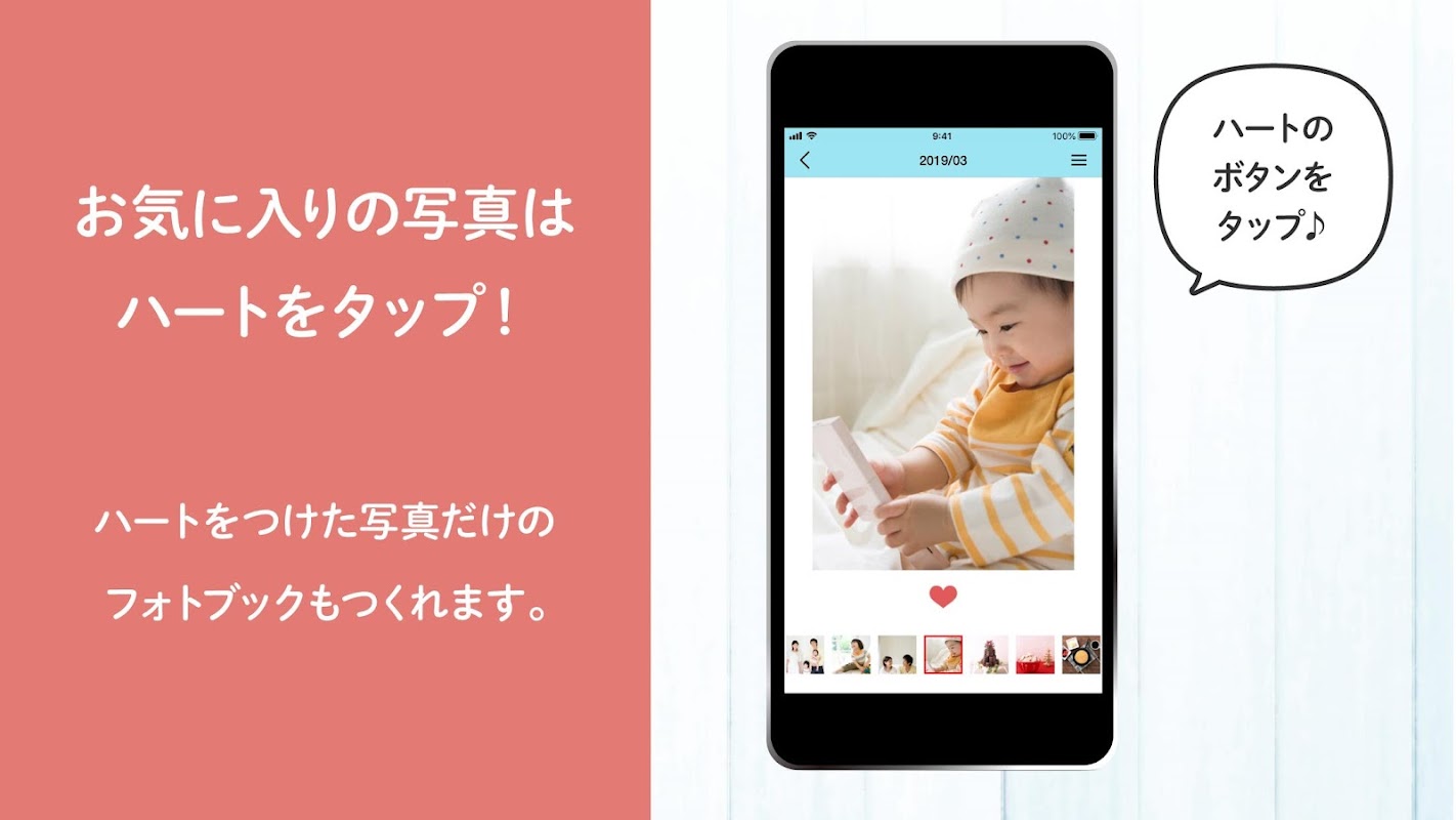 お持ちの写真を撮影日に応じて検索できます。またお気に入りの写真にハートマークをつけると、ハートマークをつけた写真だけでフォトブックを作ることができます。ストーリー性のあるフォトブックを作成したいときにとても簡単!