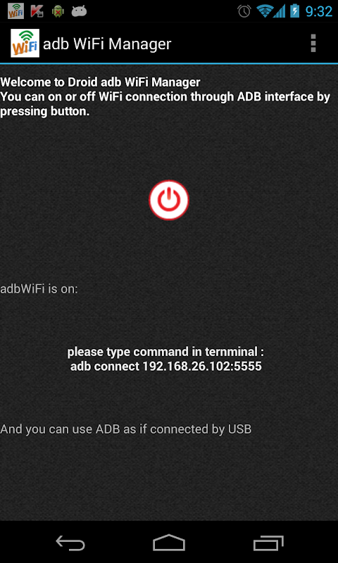 - تنفيذ هذا التطبيق (ADB الروبوت مدير واي فاي) في جهاز الروبوت الخاص بك.