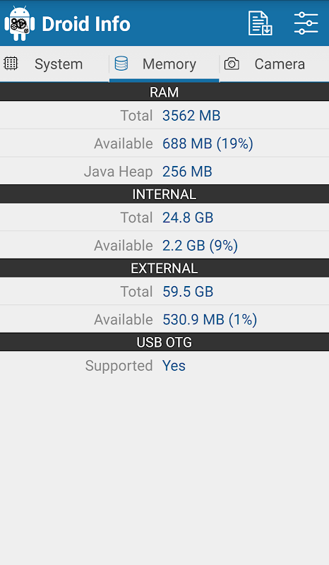 - الذاكرة : توتال وذاكرة الوصول العشوائي المتاحة، وكذلك معلومات حول تخزين الجهاز.