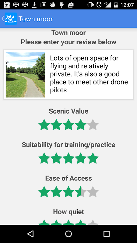 This app provides a way for people to share appropriate and legal sites they have found for flying, wherever they are in the world. Be it a large, unobstructed open area; easily accessible public right of way for taking off from; beautiful scenery in open airspace for taking stills and video of; or all of the above!