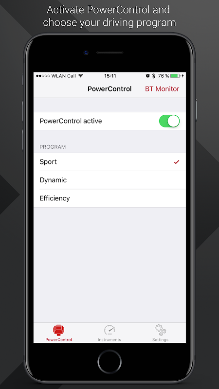 مع التطبيق PowerControl جديد يمكنك تشغيل ضبط وإيقاف وتحديد أداء المحرك الخاص بك من أصل 3 برامج. وعلاوة على ذلك، يمكنك ان ترى كل بيانات الأداء الرئيسية لمحرك في لوحة الرياضة أداة حية. التسارع مبتكر يظهر لك ز القوى التي تؤثر على سيارتك أفقيا وطوليا - للحصول على أقصى تسارع مع الجر آمن.