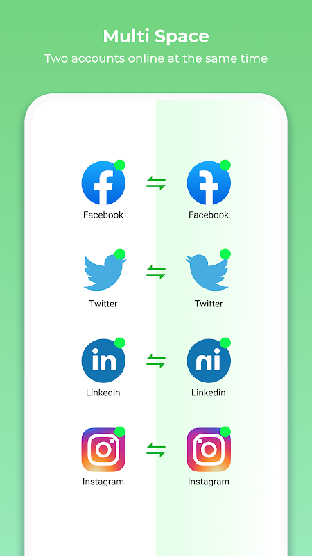Multi Space is an app that provides natural & separate virtual environment for Android users to clone and run multiple accounts of the same app simultaneously on one device, and also enables users to create their customized space.