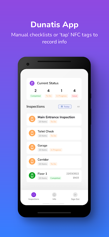 يستخدم Dunatis الأجهزة المحمولة لتسجيل عمليات الفحص المادي بسهولة مقترنة بالتقارير الحية والتاريخية. يوفر لك الوقت والمال والغرامات المحتملة.