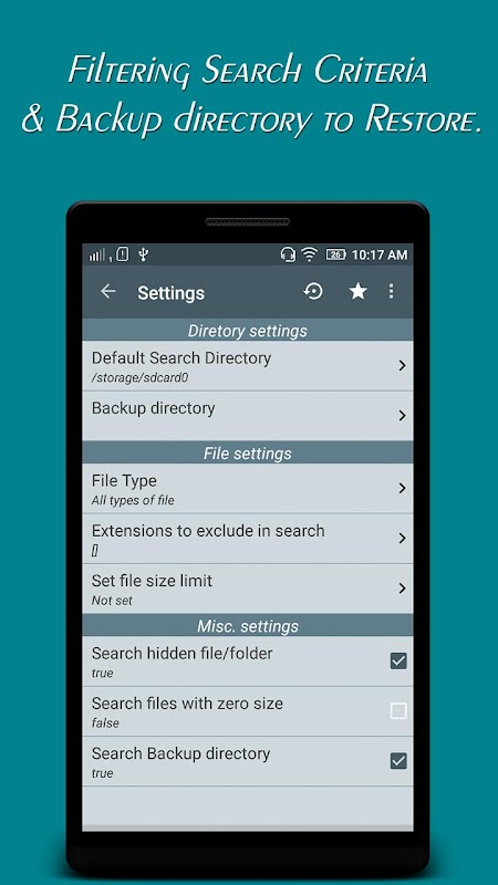- الذهاب إلى إعدادات وتكون هناك فرصة لتصفية معايير البحث على سبيل المثال، تتضمن ملفات معينة مثل .MP3 أو .mp4، بابوا نيو غينيا، jpg و هلم جرا.