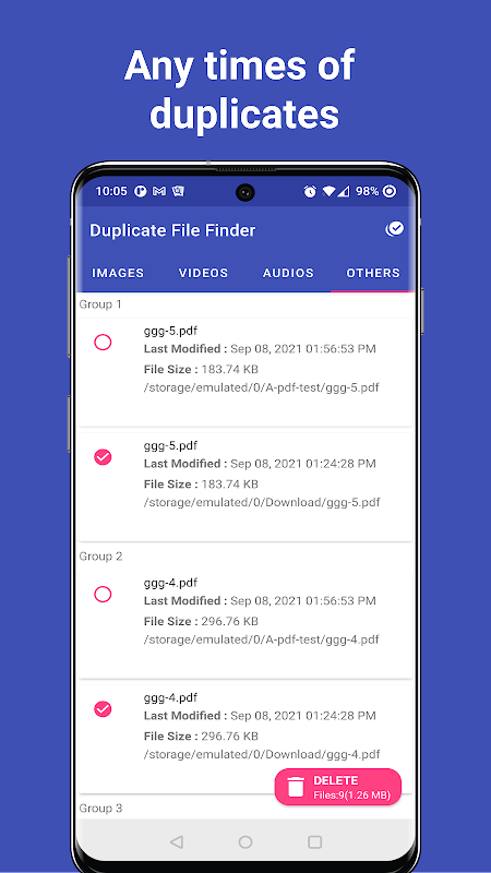 يمكن أن تتسبب الملفات المكررة في حدوث مشكلات في هاتفك. يحل هذا التطبيق المشكلات التالية.
