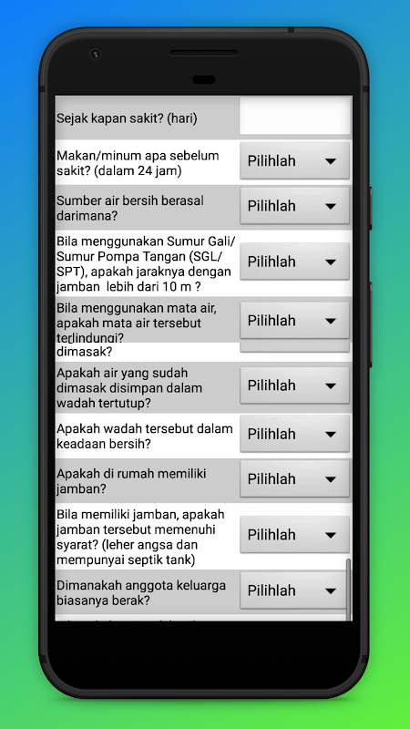 يمكن استخدام هذا التطبيق لتحديد سبب الإسهال من خلال تحديد عوامل الخطر بما في ذلك الغذاء وحركات الأمعاء والسلوك ومصادر المياه النظيفة والبيئة. يوفر هذا التطبيق الاقتراحات والمدخلات لإجراء تحسينات على مرافق الصرف الصحي والتغيرات السلوكية للتغلب على أمراض الإسهال. لا يمكن استخدام هذا التطبيق فقط من قبل العاملين الصحيين ، ولكن يمكن أيضًا استخدامه من قبل الكوادر الصحية وعامة الناس. مرجع الطلب هو لائحة وزير الصحة رقم 13 من 2015.