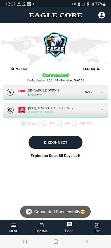 EAGLE CORE هو تطبيق VPN قوي يوفر اتصال إنترنت آمن وموثوق لمستخدميه. يدعم التطبيق البروتوكولات الشائعة مثل OpenVPN و SSH و UDP ، مما يضمن أن المستخدمين يمكنهم اختيار البروتوكول الذي يناسب احتياجاتهم. مع EAGLE CORE ، يمكنك تصفح الإنترنت بشكل مجهول والوصول إلى المحتوى المقيد جغرافيًا بسهولة.