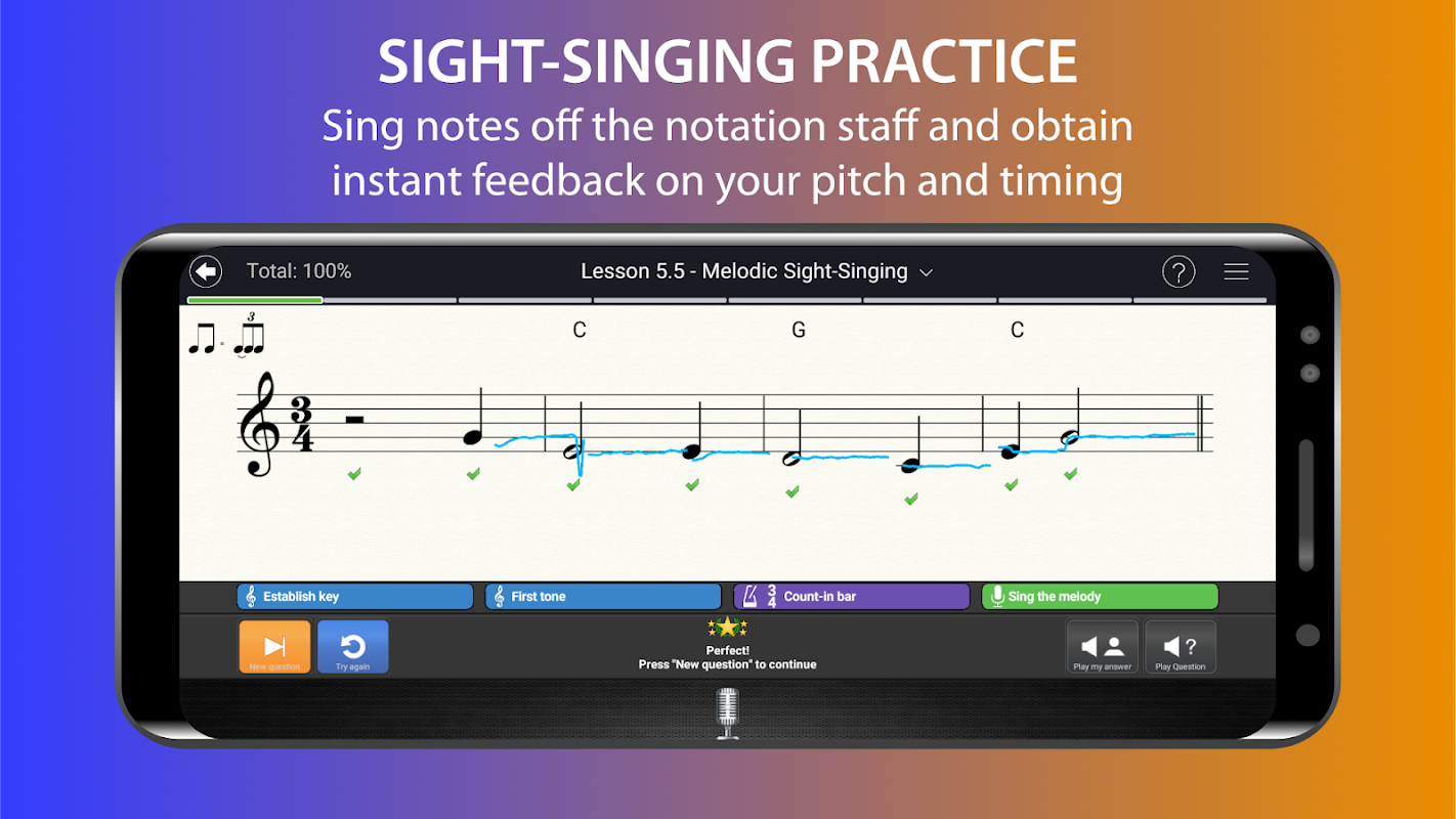 تدريب شامل للأذن - تدرب على الفواصل، والكوردات، وانعكاسات الكوردات، والسُلالم، والتتابعات التوافقية، والألحان، والإيقاع، والمزيد. تعلم الغناء من النظرة الأولى - غنِّ النوتات الموسيقية المعروضة على الشاشة في ميكروفون جهاز iPad أو iPhone واحصل على تقييم فوري لدقتك في النغمة والتوقيت.