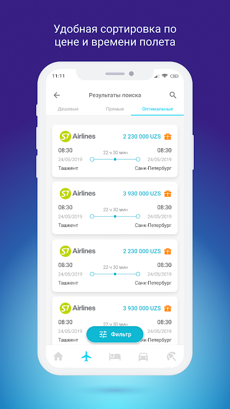 Пользователи могут воспользоваться фильтрами и выбрать авиабилет, подходящее по большому количеству разных параметров: классу, стоимости, продолжительности пути, по авиакомпаниям, времени прибытия, времени стыковки, а также система подскажет самый оптимальный вариант для полета.