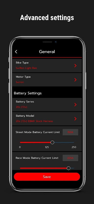 ثانيًا، تسمح علامة التبويب "الإعدادات" بتخصيص دراجتك بشكل متعمق. في قائمة الإعداد العام، يمكنك تكوين معلمات الدراجة (نوع الدراجة، نوع المحرك، نوع البطارية، حجم العجلة المسننة، حجم العجلة، وما إلى ذلك) لضمان صحة الضبط لمكوناتك وإنشاء نطاقات آمنة للتعديلات المخصصة. في قوائم الإعدادات الأخرى، يمكنك إعداد أوضاع ركوب مخصصة، وضبط حدود السرعة، وإعدادات الطاقة والحساسية، وإعدادات عزم الدوران، وإضعاف المجال، والمزيد من الإعدادات المخصصة لتكييف أداء دراجتك وفقًا لاحتياجاتك المحددة.