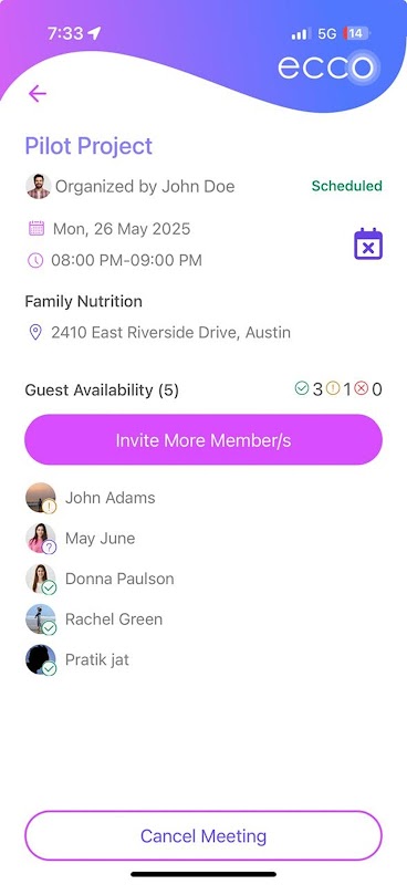هل سئمت من فوضى الدردشة الجماعية كلما حاولت التخطيط للقاء؟ سواءً كان اجتماعًا جماعيًا، أو لقاءً مع الأصدقاء، أو موعدًا سريعًا لتناول القهوة، يُسهّل ECCO عليك إيجاد الوقت والمكان المثاليين اللذين يُناسبان الجميع.