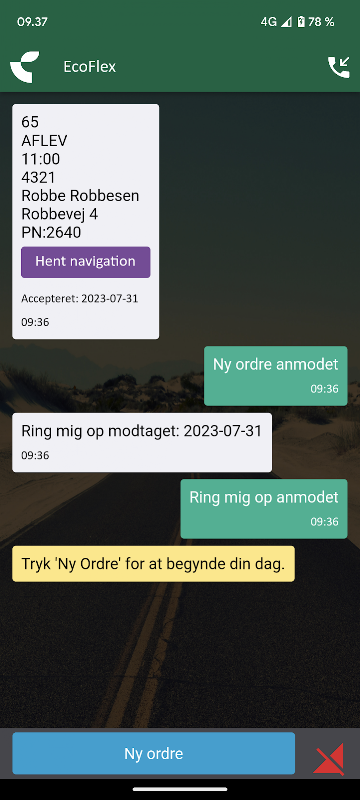 - عند "الحصول على نظام الملاحة" ، يتم إرسال طلب إلى FlexDanmark ، والذي يرسل موقعًا مرة أخرى إلى التطبيق ، وبعد ذلك تبدأ التنقل في تطبيق خرائط Google. لا يزال تطبيق ecoFlex نشطًا في الخلفية